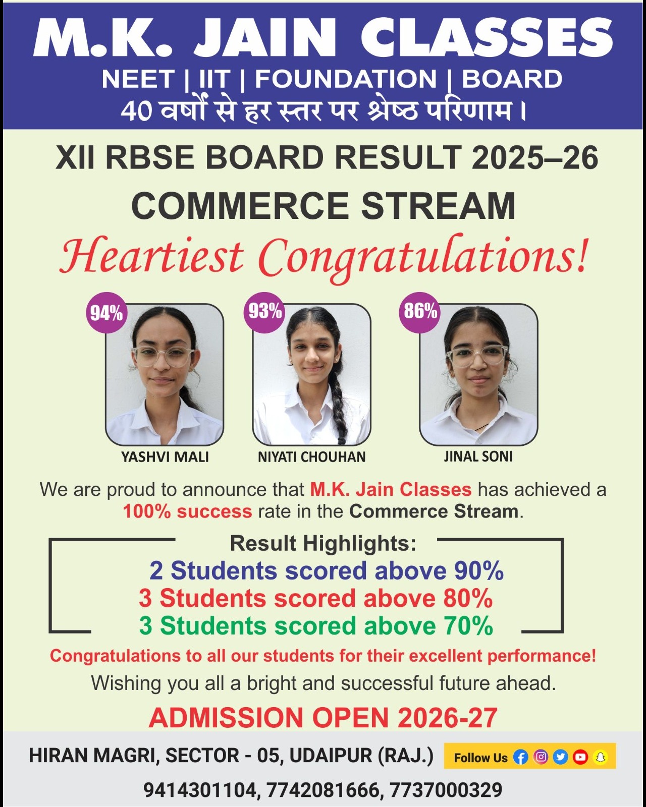 Admission Open 2026-27 | 40 Yrs of Legacy | Enroll Today MKJAINCLASSES PVT.LTD UDAIPUR Why MKJC ? - 40 Years of excellence. - SCHOOL+COACHING+COMPETITION - Play school to class 12th. - Best school integrated program. - Experienced faculty. - Result oriented coaching. * Produced 800 doctors & 16000 engineers so far. * Student focused program. * Admission open!! Play school to class 12th. Science BIO, MATHS- NEET, JEE. Study centre. 1) MKJC SCHOOL Hiran magri sector-5 Udaipur. 📞 Call - 7737000326, 7742081666