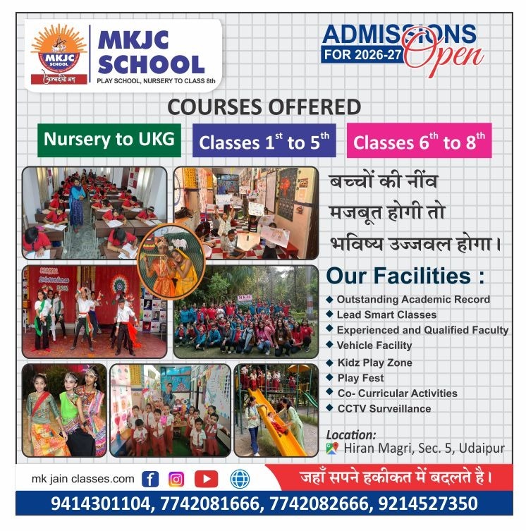 MKJC SCHOOL Why MKJC ? - 40 Years of excellence. - SCHOOL+COACHING+COMPETITION - Play school to class 12th. - Best school integrated program. - Experienced faculty. - Result oriented coaching. * Produced 800 doctors & 16000 engineers so far. * Student focused program. * Admission open!! Play school to class 12th. Science BIO, MATHS- NEET, JEE. COMMERCE, CA, CS, CMA Study centre. 1) Mkjc, navbharat school campus, Ashok nagar Udaipur. 2) MKJC SCHOOL Hiran magri sector-5 Udaipur. 📞 Call - 7737000326, 7742081666 #playschool #School #Coaching #Students #neet #iitjee #Education