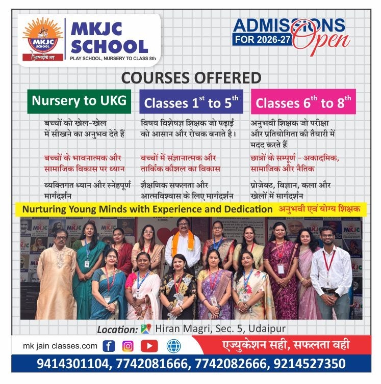MKJC SCHOOL Why MKJC ? - 40 Years of excellence. - SCHOOL+COACHING+COMPETITION - Play school to class 12th. - Best school integrated program. - Experienced faculty. - Result oriented coaching. * Produced 800 doctors & 16000 engineers so far. * Student focused program. * Admission open!! Play school to class 12th. Science BIO, MATHS- NEET, JEE. COMMERCE, CA, CS, CMA Study centre. 1) Mkjc, navbharat school campus, Ashok nagar Udaipur. 2) MKJC SCHOOL Hiran magri sector-5 Udaipur. 📞 Call - 7737000326, 7742081666 #playschool #School #Coaching #Students #neet #iitjee #Education