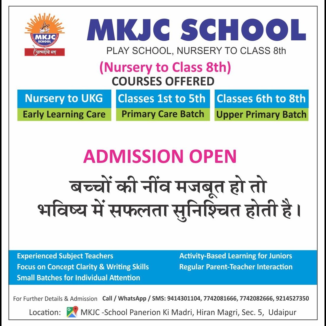MKJC SCHOOL UDAIPUR Why MKJC ? - 40 Years of excellence. - SCHOOL+COACHING+COMPETITION - Play school to class 12th. - Best school integrated program. - Experienced faculty. - Result oriented coaching. * Produced 800 doctors & 16000 engineers so far. * Student focused program. * Admission open!! Play school to class 12th. Science BIO, MATHS- NEET, JEE. COMMERCE, CA, CS, CMA Study centre. 1) Mkjc, navbharat school campus, Ashok nagar Udaipur. 2) MKJC SCHOOL Hiran magri sector-5 Udaipur. 📞 Call - 7737000326, 7742081666 #School #Coaching #Students #neet #iitjee #Education