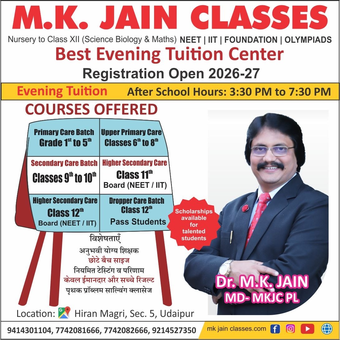 Admission Open Session 2025-26 MKJAINCLASSES PVT.LTD UDAIPUR Why MKJC ? - 40 Years of excellence. - SCHOOL+COACHING+COMPETITION - Play school to class 12th. - Best school integrated program. - Experienced faculty. - Result oriented coaching. * Produced 800 doctors & 16000 engineers so far. * Student focused program. * Admission open!! Play school to class 12th. Science BIO, MATHS- NEET, JEE. COMMERCE, CA, CS, CMA Study centre. 1) Mkjc, navbharat school campus, Ashok nagar Udaipur. 2) MKJC SCHOOL Hiran magri sector-5 Udaipur. 📞 Call - 7737000326, 7742081666 #School #Coaching #Students #neet #iitjee #Education