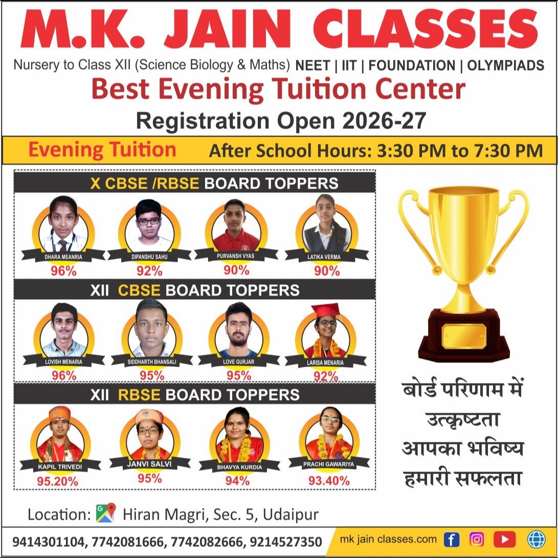 Admission Open Session 2025-26 MKJAINCLASSES PVT.LTD UDAIPUR Why MKJC ? - 40 Years of excellence. - SCHOOL+COACHING+COMPETITION - Play school to class 12th. - Best school integrated program. - Experienced faculty. - Result oriented coaching. * Produced 800 doctors & 16000 engineers so far. * Student focused program. * Admission open!! Play school to class 12th. Science BIO, MATHS- NEET, JEE. COMMERCE, CA, CS, CMA Study centre. 1) Mkjc, navbharat school campus, Ashok nagar Udaipur. 2) MKJC SCHOOL Hiran magri sector-5 Udaipur. 📞 Call - 7737000326, 7742081666 #School #Coaching #Students #neet #iitjee #Education
