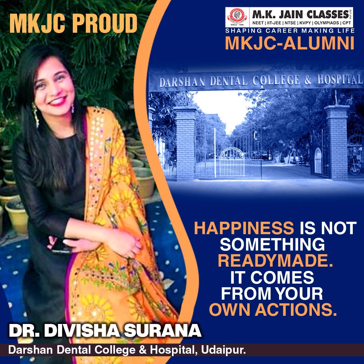 MKJC-ALUMNI | MKJC PROUD | Dr. DIVISHA SURANA Top choice of rankers. #Since 1986. #35 years of excellence. Mkjainclasses pvt.ltd.Udaipur. Download Mk Jain Classes app from Playstore or Join "100%Free Lectures" on our Youtube channel.Just subscribe now!Follow us on Facebook.For more information:-Visit Our Head Office🏤 Durga Nursery Road, Udaipur313 001 Udaipur, RajasthanFor Inquiries Call Us At📱0294-2421977 | 9414301104 | 7742082666 | 9214527350 | 7737000326 | 7742012666Toll-Free No.📞 08048890574Email📧 mkjainclasses1@gmail.com | md_mkjc@yahoo.co.inDownload⬇ Our App From Play Store📱 For Exclusive Content:- MK JAIN CLASSESVisit🌎 http://www.mkjainclasses.com/ | http://www.mkjainclasses.in/Our Other Branches:MKJC-SIP International Schooling:Nav Bharat Sr. Sec. School, Road No.8, Ashok NagarMKJC-Smart Education Centre:Hiran Magri, Sec-6, Main Road, Udaipur-313001MKJC-Smart SIP Schooling:Shiksha Niketan Sr. Sec. School, Paneriyon ki Madri, Sec-6, Hiran Magri, Udaipur#MKJainClasses #OnlineClasses #CoachingInstitute #MKJCSIP #Schooling #BestResults #Coaching #ExperiencedFaculty #Education #AdmissionsOpen #NEET #IITJEE #KVPY #NTSE #JET #ICAR #Olympiads #CPT