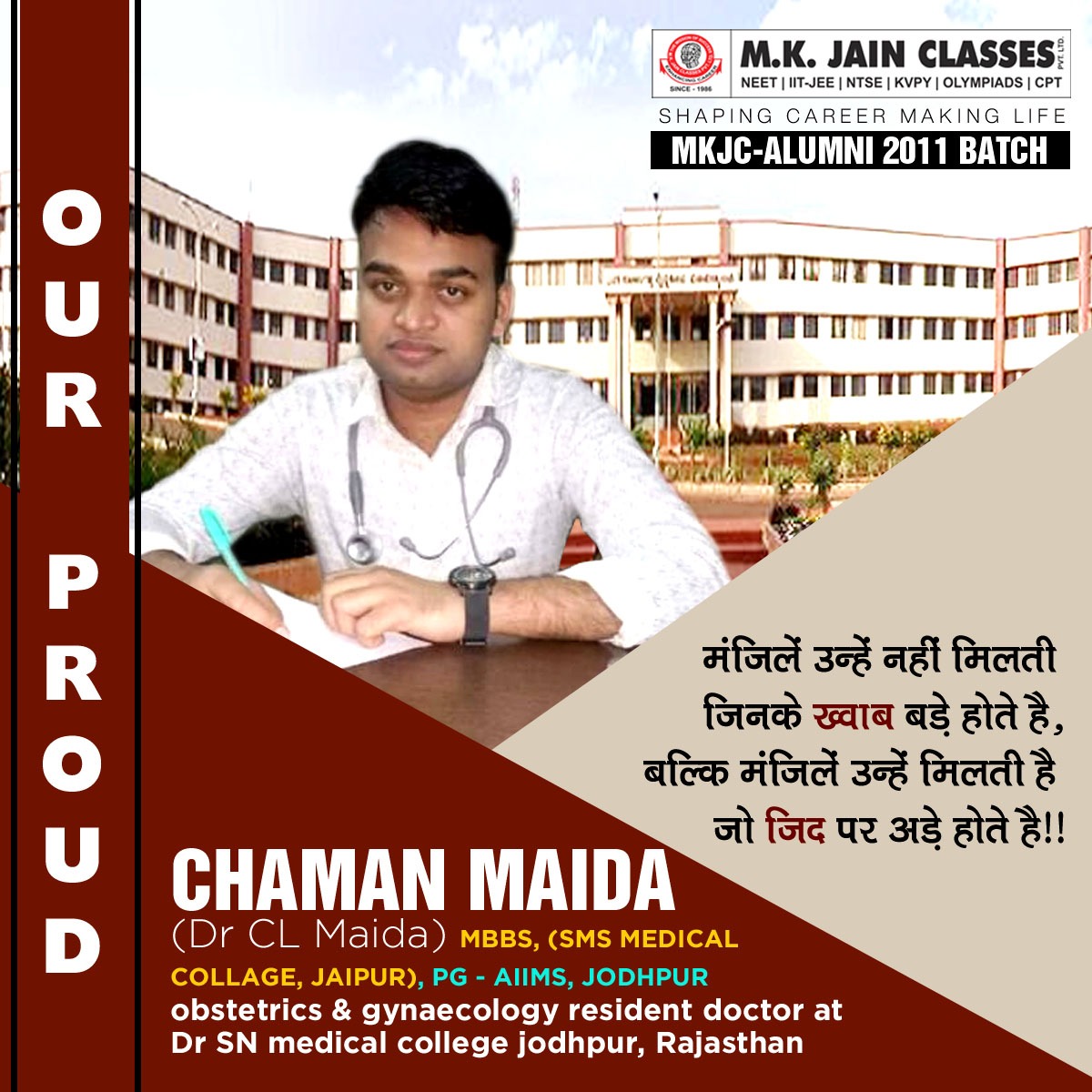 MKJC PROUD.Dr C.L.MAIDA .MKJC ALUMNI 2011 BATCH. #MKJAIN CLASSES PVT.LTD. Our Other Branches:MKJC-SIP International Schooling:Nav Bharat Sr. Sec. School, Road No.8, Ashok NagarMKJC-Smart Education Centre:Hiran Magri, Sec-6, Main Road, Udaipur-313001MKJC-Smart SIP Schooling:Shiksha Niketan Sr. Sec. School, Paneriyon ki Madri, Sec-6, Hiran Magri, Udaipur For more information:-Visit Our Head Office🏤 Durga Nursery Road, Udaipur313 001 Udaipur, RajasthanFor Inquiries Call Us At📱0294-2421977 | 9414301104 | 7742082666 | 9214527350 | 7737000326 | 7742012666Toll-Free No.📞 08048890574