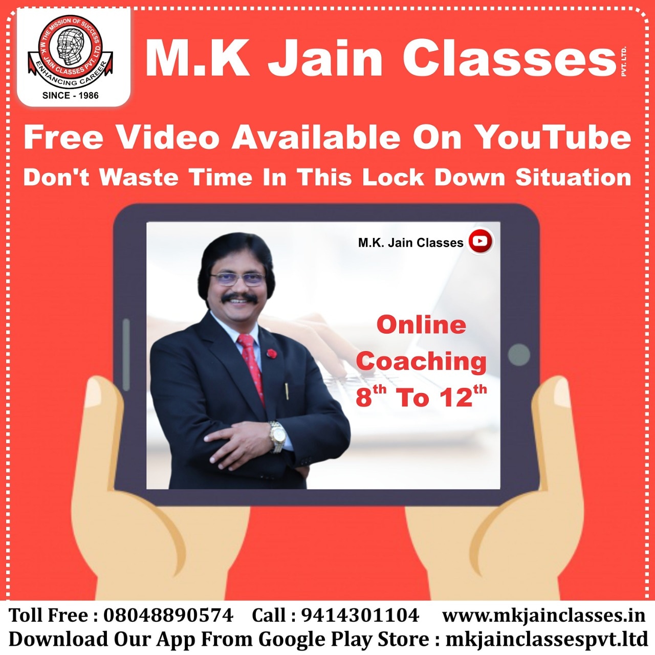 Please stay at home and stop corona .Start online coaching with M.K. JAIN CLASSES PVT. LTD. Udaipur in three steps : 1) Subscribe M.K. JAIN CLASSES you tube channel 2) like M.K. JAIN CLASSES Facebook page 3) send your whatsapp no. along with class on toll free number-08048890574